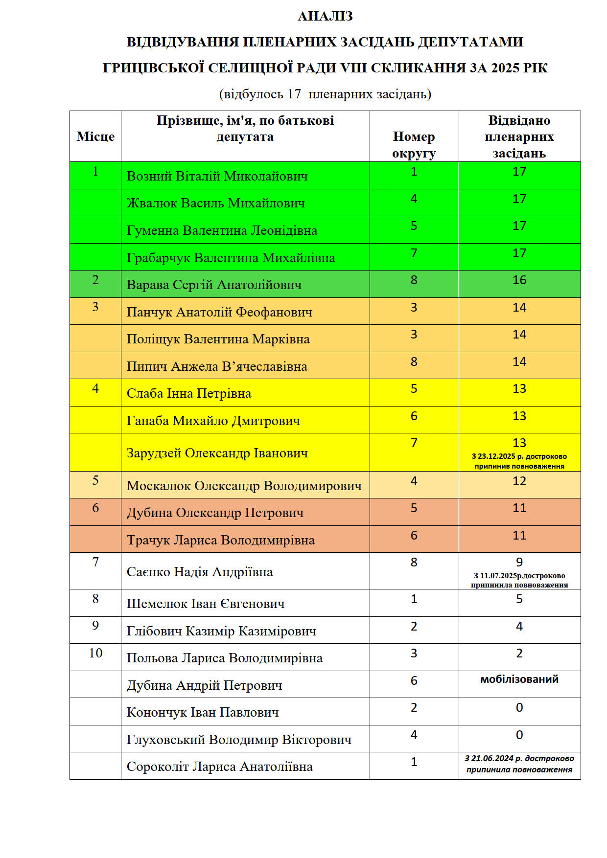 Аналіз відвідування пленарних засідань депутатами Грицівської селищної ради VIII скликання за 2023 рік