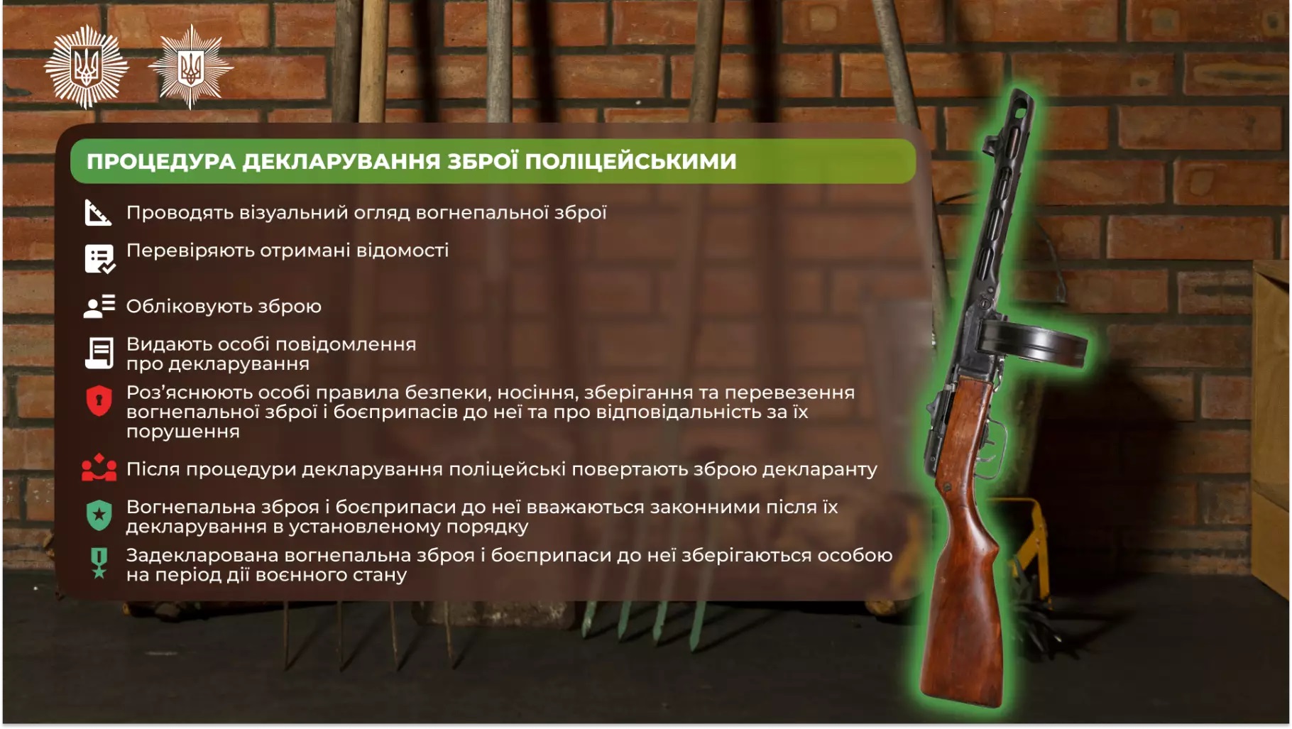 • Упродовж 24 годин прибути до найближчого підрозділу поліції за місцем Вашого перебування для декларування зброї або боєприпасів